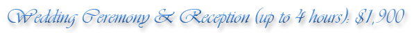 This includes pre-ceremony arrival photography, last minute bride and groom preparations, the wedding, departure images and wedding party shots prior to the reception. Time begins once we arrive at the ceremony site at the agreed upon time and ends once the guests depart seated ceremony location. Time spent in excess of the three hour package will be billed at $60 per hour in 30 minute increments.